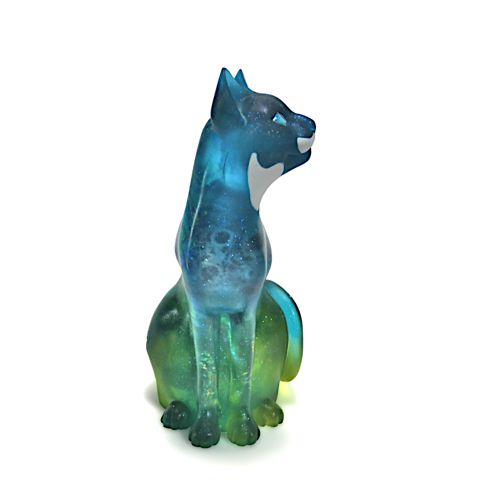 Cast in cool greens, deep teal, and shadowed blue tones, his resin body glows with layered depth, shifting from forested green to moonlit sea hues. Fine shimmer drifts through him like starlight held at a respectful distance. At his core rests a visible embedded moon, steady and composed, exactly where it ought to be.